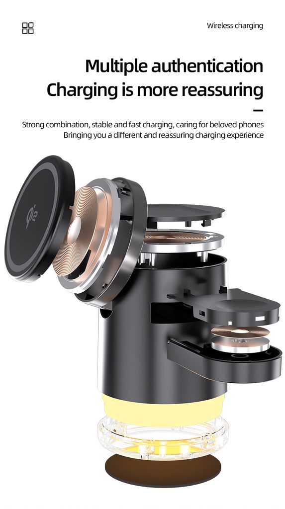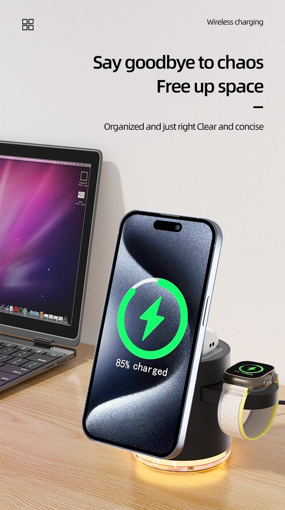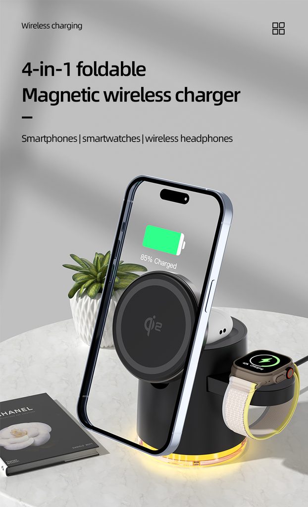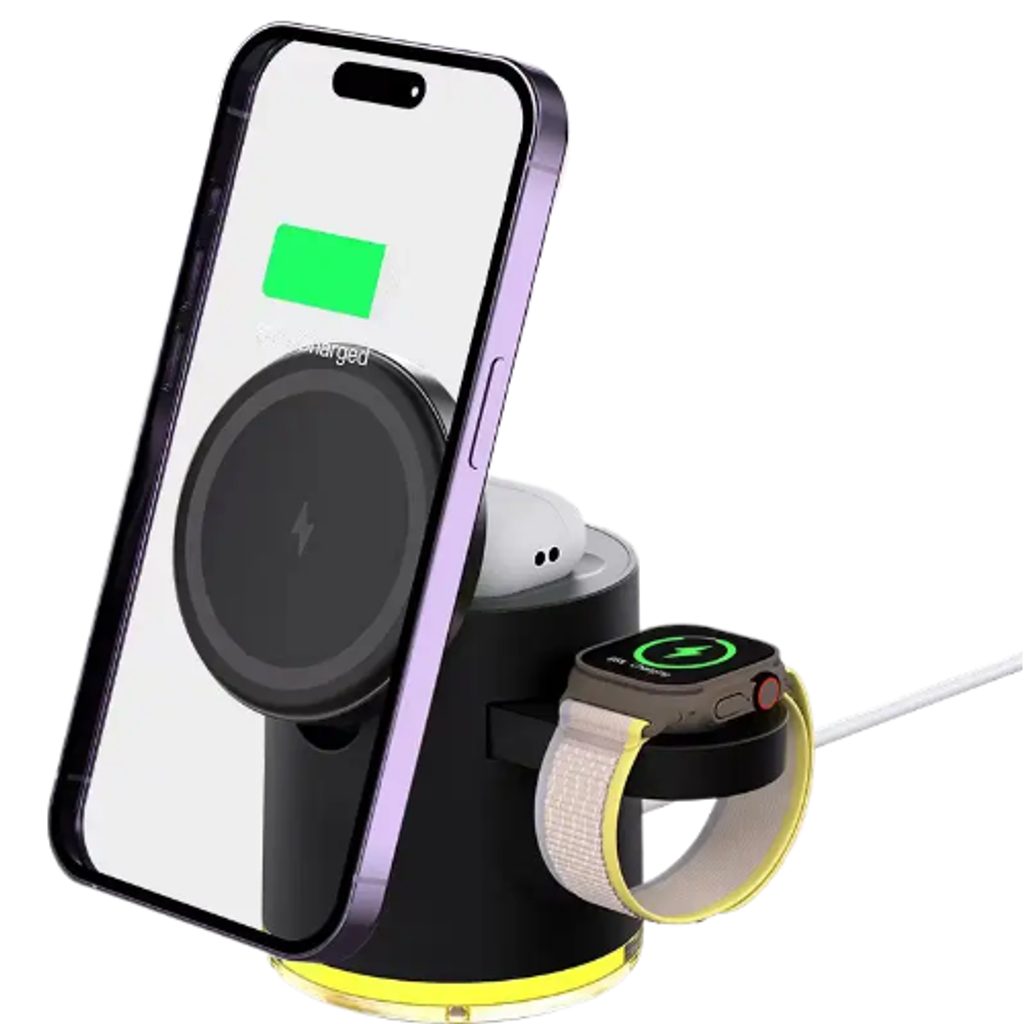 Κομψός και πρακτικός ασύρματος φορτιστής, που μπορεί να φορτίσει έως και τέσσερις συσκευές ταυτόχρονα – iPhone, Apple Watch, AirPods και άλλες. Χάρη στην μαγνητική στήριξη εξασφαλίζει σταθερότητα και ο σύγχρονος σχεδιασμός του συμπληρώνει τέλεια το γραφείο ή το κομοδίνο σας.