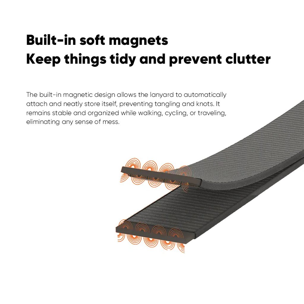 Οι ενσωματωμένοι μαλακοί μαγνήτες επιτρέπουν στο κορδόνι να "ευθυγραμμιστεί" από μόνο του και να διατηρήσει το σχήμα του, έτσι δεν μπερδεύεται στην τσάντα, στις τσέπες ή κατά τη μεταφορά.