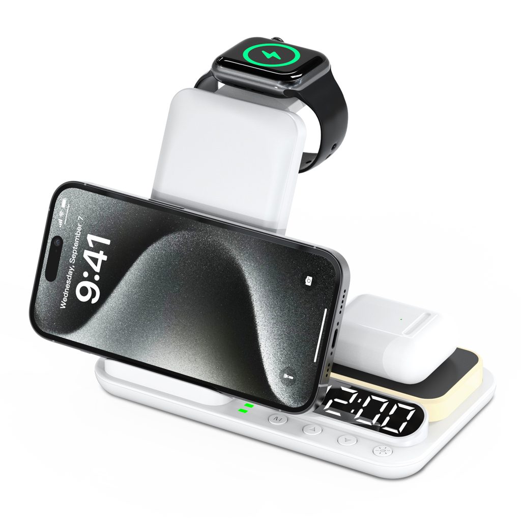 Το FoldCharge Clock 5 Pro συνδυάζει ασύρματο φορτιστή για τηλέφωνο, ακουστικά και έξυπνο ρολόι με ψηφιακό ξυπνητήρι και ρυθμιζόμενο φωτιστικό νυκτός. Πρακτική λύση για κομοδίνο ή γραφείο που αντικαθιστά πολλές ξεχωριστές συσκευές.