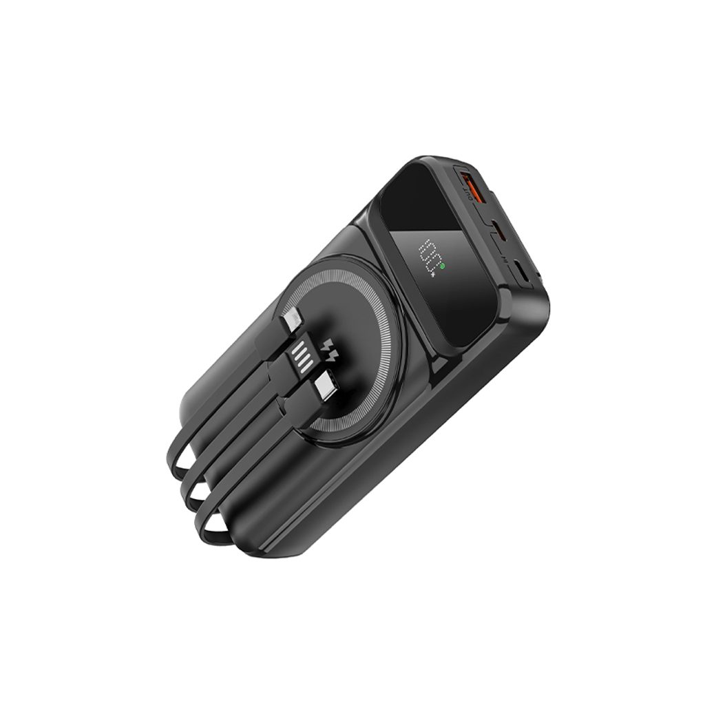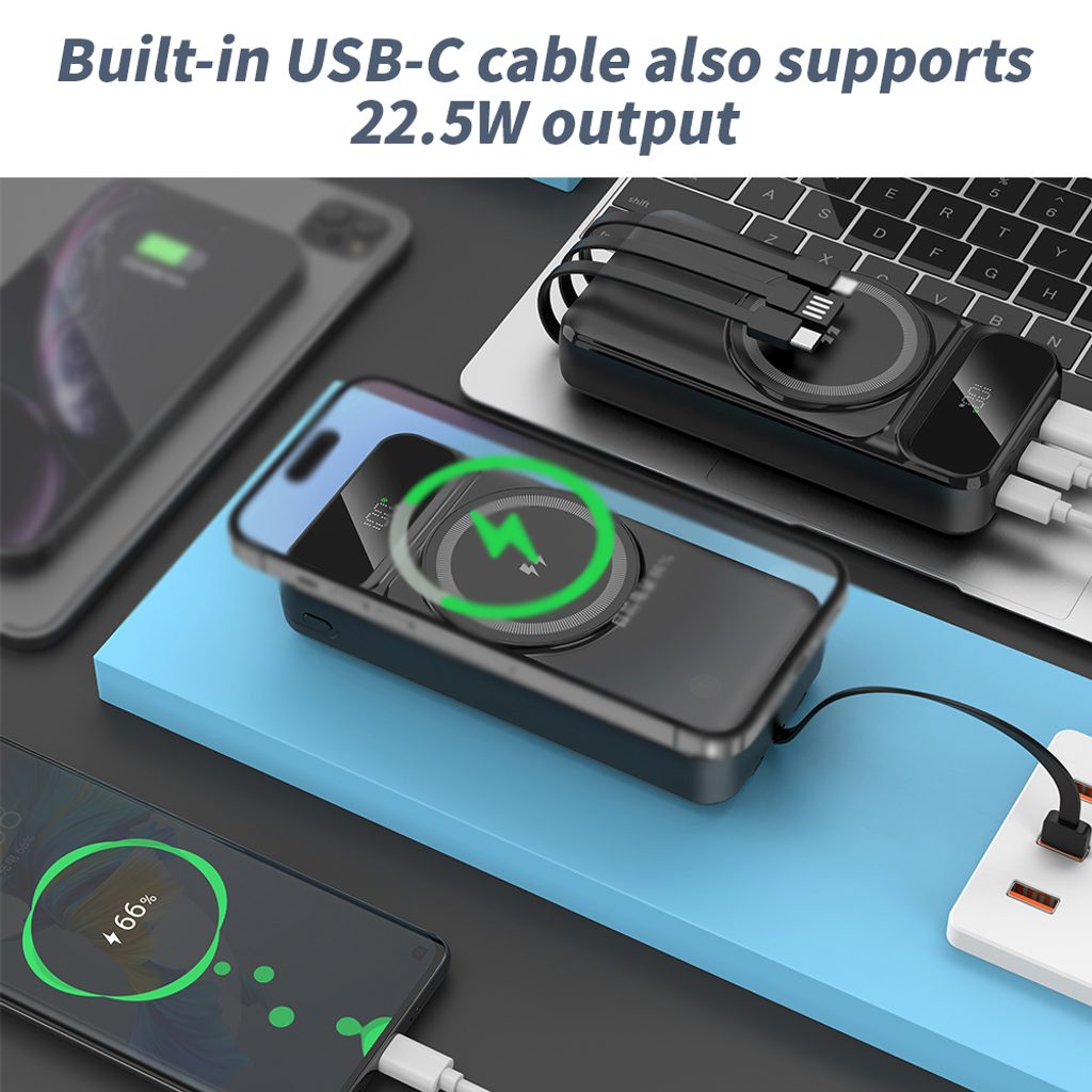 Η πιο ισχυρή παραλλαγή αυτού του powerbank σε μέγεθος L συνδυάζει τεράστια χωρητικότητα 20.000 mAh, 15W MagSafe ασύρματη φόρτιση, 22,5W ταχεία φόρτιση μέσω καλωδίου και τρία ενσωματωμένα καλώδια φόρτισης απευθείας στο σώμα του powerbank.