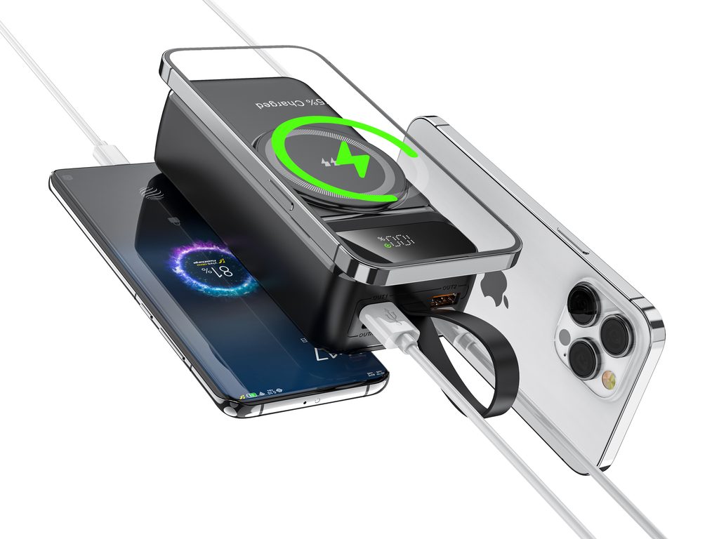Η πιο ισχυρή παραλλαγή αυτού του powerbank σε μέγεθος L συνδυάζει τεράστια χωρητικότητα 20.000 mAh, 15W MagSafe ασύρματη φόρτιση, 22,5W ταχεία φόρτιση μέσω καλωδίου και τρία ενσωματωμένα καλώδια φόρτισης απευθείας στο σώμα του powerbank.