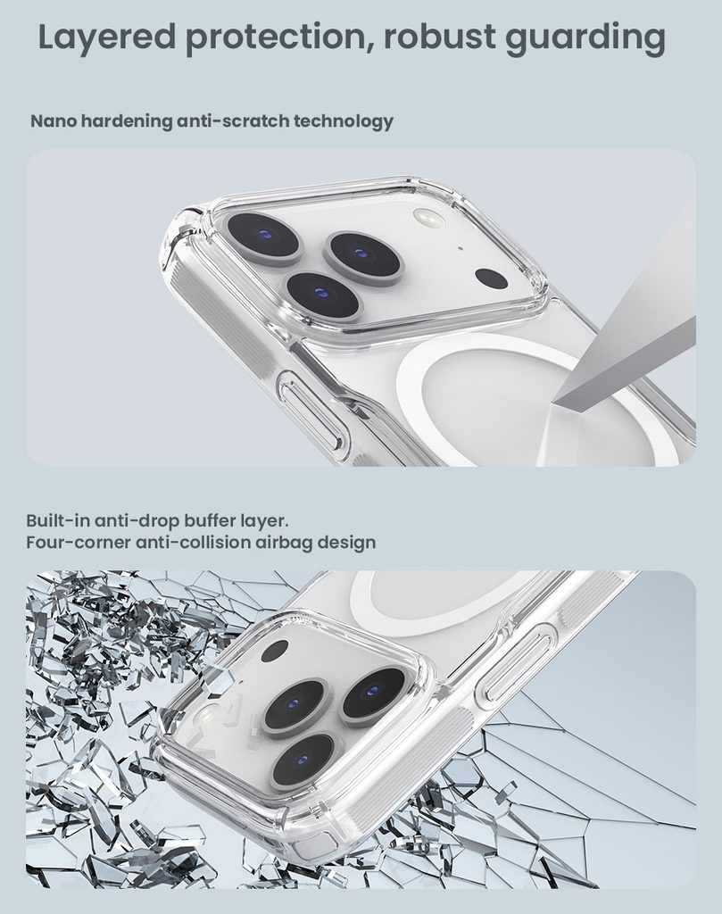 Σε σύγκριση με την κλασική έκδοση Nature TPU, αυτή η θήκη είναι κατασκευασμένη από συνδυασμό δύο υλικών, πολυκαρβονικό (PC) και θερμοπλαστική πολυουρεθάνη (TPU), και είναι εξοπλισμένη με μαγνήτη, εξασφαλίζοντας σταθερότητα χρώματος και αντοχή στο κιτρίνισμα. Το σκληρό πολυκαρβονικό στο πίσω μέρος της θήκης παρέχει αντοχή στις γρατσουνιές, ενώ το ελαστικό υλικό TPU στις πλευρές εξασφαλίζει άνετη χρήση και προστασία από κρούσεις. Η θήκη προστατεύει αξιόπιστα το τηλέφωνό σας από γρατσουνιές, σκόνη και πτώσεις, ενώ ο λεπτός και διάφανος σχεδιασμός δίνει στο τηλέφωνο κομψή εμφάνιση. Επιπλέον, υποστηρίζει ασύρματη φόρτιση χάρη στο χαμηλό πάχος του υλικού. Οι ακριβείς εγκοπές επιτρέπουν εύκολη πρόσβαση σε όλα τα στοιχεία ελέγχου και τους συνδέσμους, εξασφαλίζοντας άνετη χρήση του τηλεφώνου.