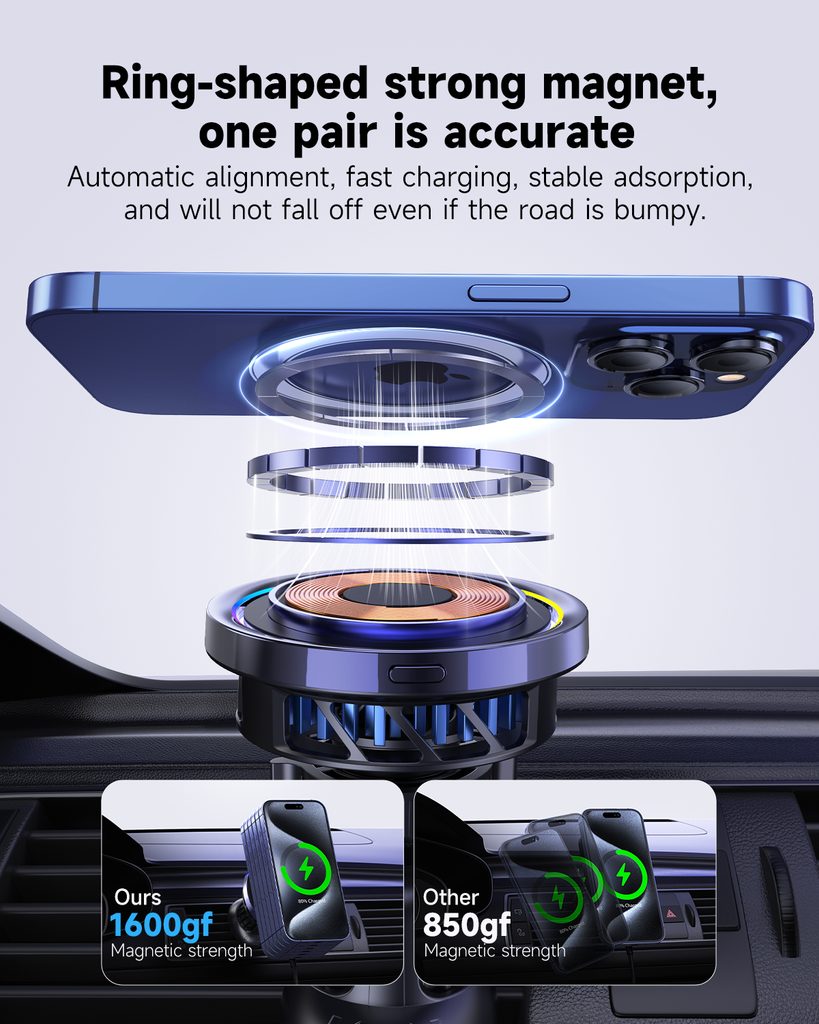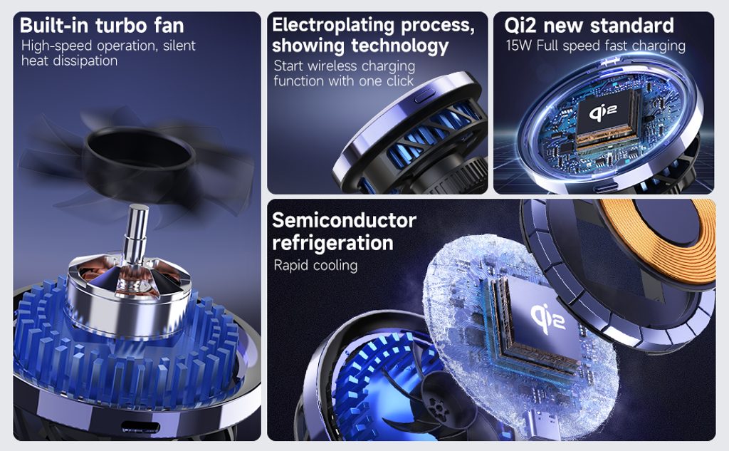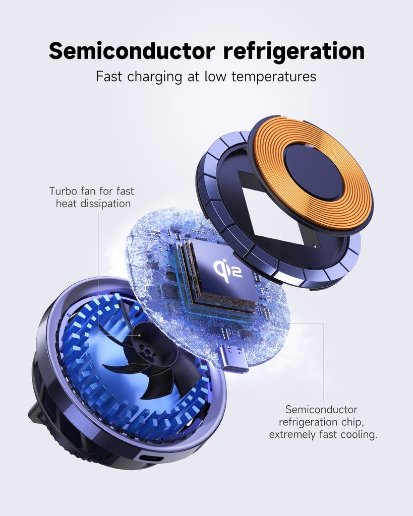 Αυτή η ψύκτρα MagSafe Qi2 συνδυάζει σύγχρονη τεχνολογία ασύρματης φόρτισης με προηγμένο σύστημα ψύξης, διασφαλίζοντας ότι το τηλέφωνο και ο φορτιστής παραμένουν σε βέλτιστη θερμοκρασία κατά τη φόρτιση. Με την εσωτερική ημιαγώγιμη ψύκτρα και τον ανεμιστήρα αέρος, η βάση ρυθμίζει αυτόματα τη θερμοκρασία, προλαμβάνοντας την υπερθέρμανση και εξασφαλίζοντας γρήγορη και σταθερή ασύρματη φόρτιση 15W.