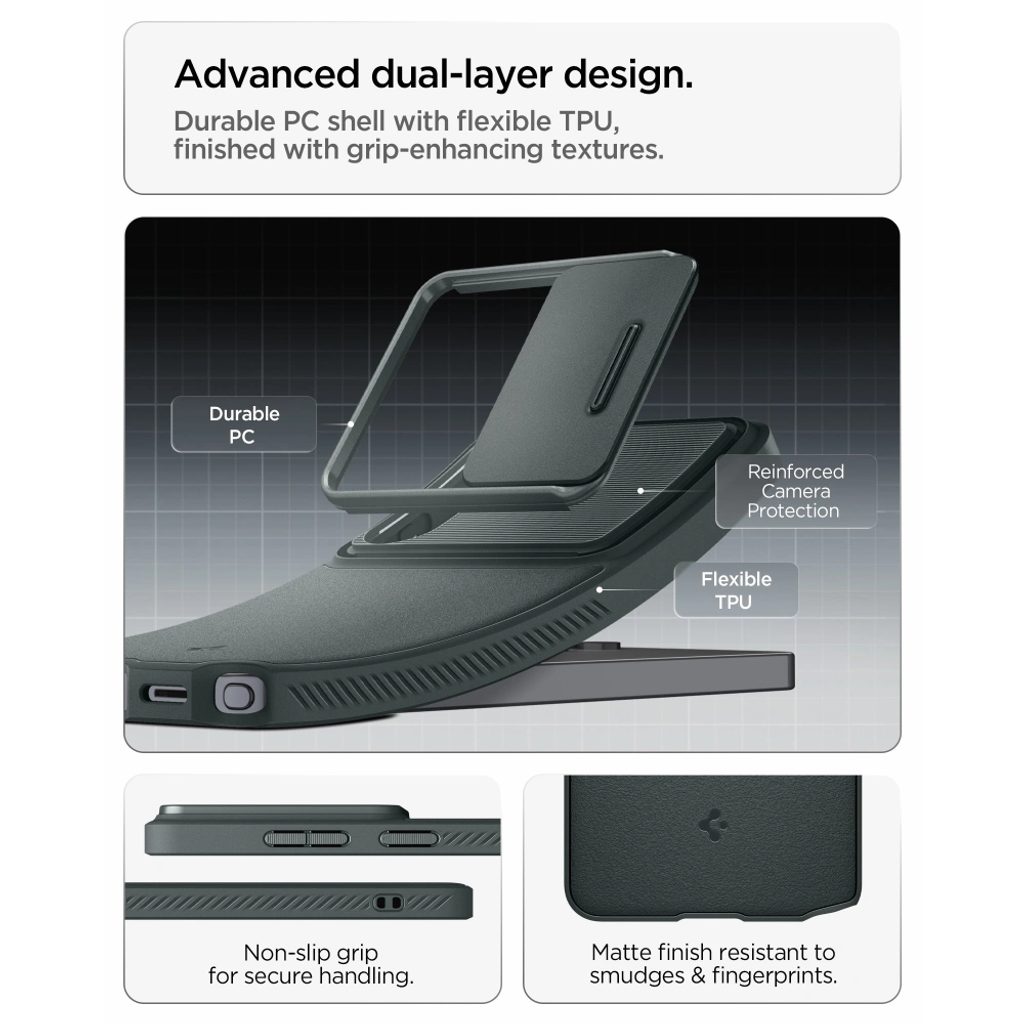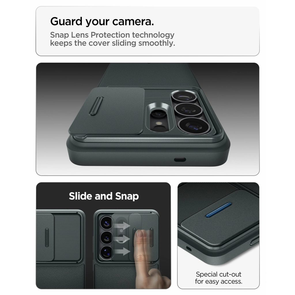 Η υβριδική θήκη Optik Armor από τη Spigen προσφέρει εξαιρετική προστασία χάρη στον συνδυασμό μαλακού TPU και σκληρού υλικού PC με συρόμενο κάλυμμα για την κάμερα. Είναι ανθεκτική σε κραδασμούς, ρύπους και δακτυλικά αποτυπώματα. Ο αντιολισθητικός σχεδιασμός εξασφαλίζει ασφαλές κράτημα και εύκολη χρήση.