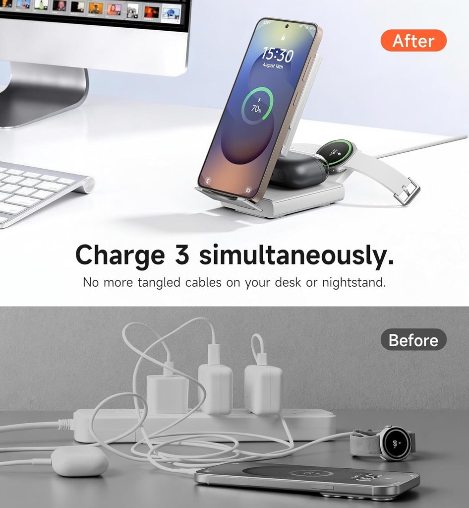 Απολαύστε τη μέγιστη άνεση με τον συμπαγή σταθμό Suritch 3σε1, σχεδιασμένο ειδικά για συσκευές Samsung. Όχι άλλα μπερδεμένα καλώδια στο γραφείο, στο γραφείο ή στα ταξίδια. Αυτός ο αναδιπλούμενος σταθμός φόρτισης επιτρέπει τη φόρτιση τριών συσκευών ταυτόχρονα, διατηρώντας παράλληλα έναν κομψό, μινιμαλιστικό σχεδιασμό.
