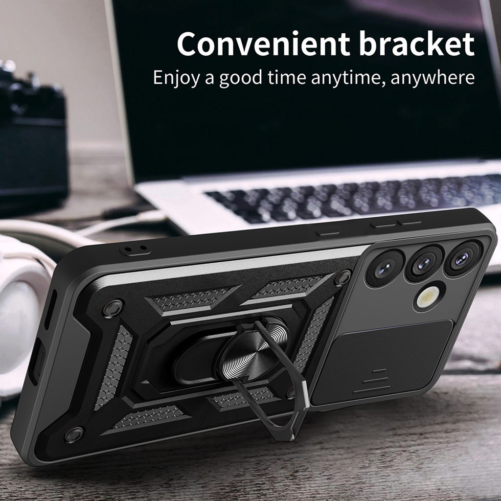 Η θήκη είναι κατασκευασμένη από ανθεκτικό πολυκαρβονικό υλικό ανθεκτικό στη φθορά, και η αντιολισθητική επεξεργασία των άκρων εξασφαλίζει άνετη χρήση του τηλεφώνου χωρίς κίνδυνο να γλιστρήσει. Είναι εξοπλισμένη με ένα απλό και βολικό συρόμενο κάλυμμα που μπορεί να ανοίξει ανά πάσα στιγμή. Το πρακτικό κάλυμμα προστατεύει τον φακό από απρόσμενες ζημιές.