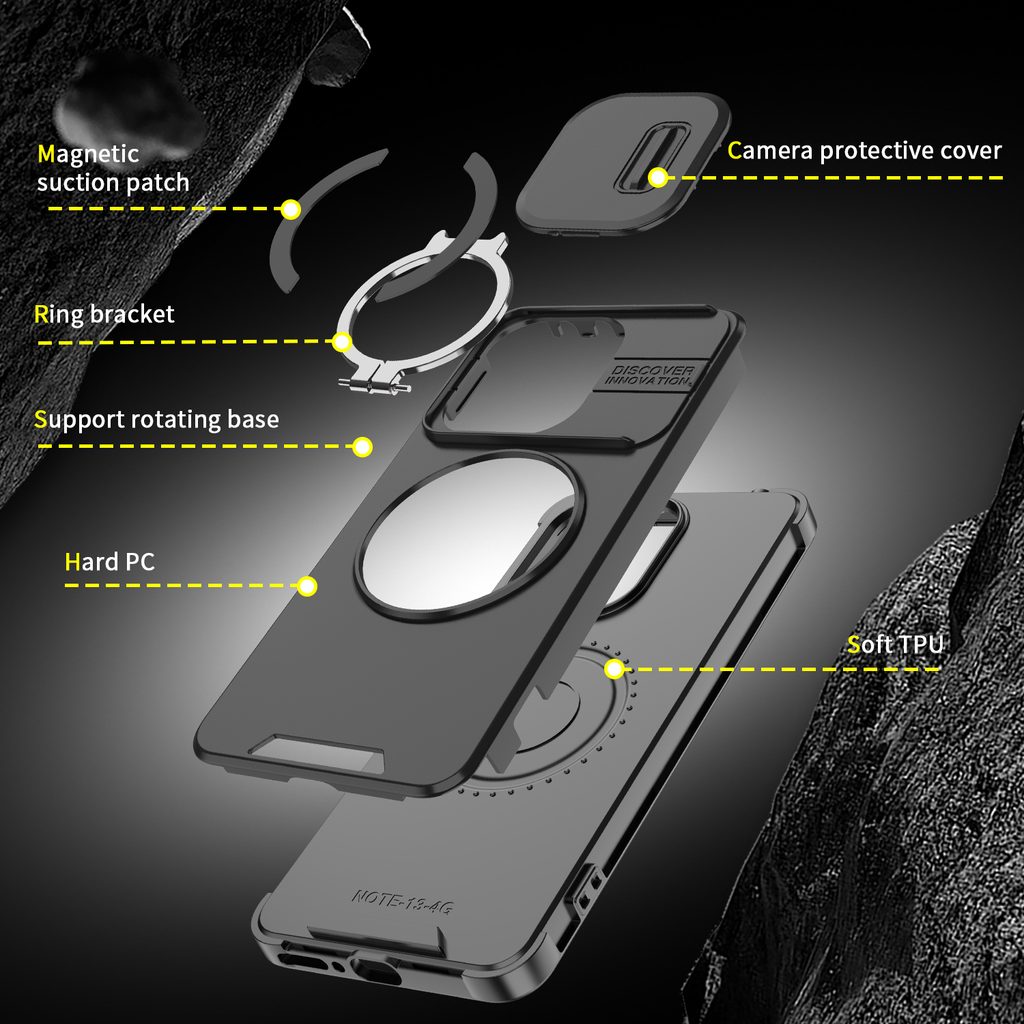 Χάρη στον μεταλλικό δακτύλιο στο πίσω μέρος της θήκης, μπορείτε να στηρίξετε άνετα το τηλέφωνό σας σε οποιαδήποτε επιφάνεια. Παρακολουθήστε βίντεο, κλήσεις ή εργαστείτε χωρίς να χρειάζεται να κρατάτε το τηλέφωνο. Το στήριγμα περιστρέφεται 360 μοίρες, προσφέροντας μέγιστη ευελιξία.