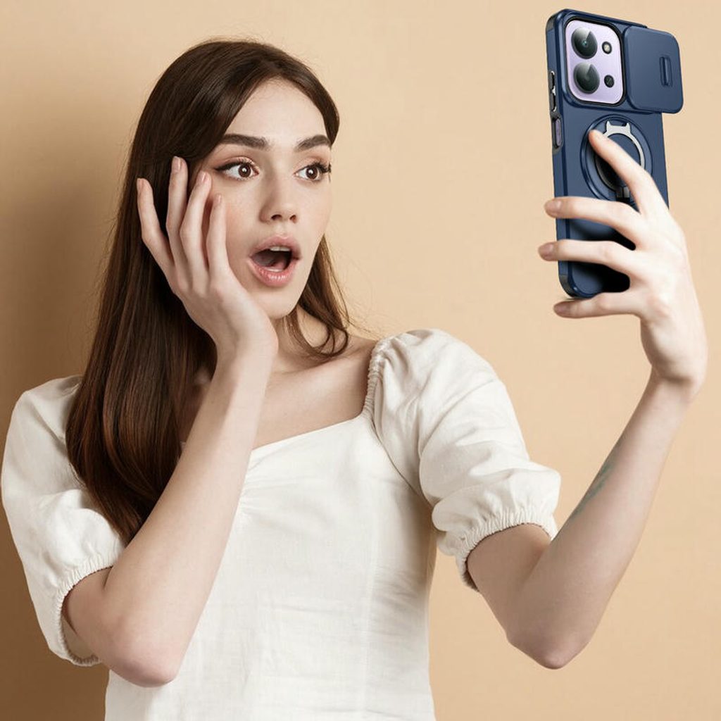 Χάρη στον μεταλλικό δακτύλιο στο πίσω μέρος της θήκης, μπορείτε να στηρίξετε άνετα το τηλέφωνό σας σε οποιαδήποτε επιφάνεια. Παρακολουθήστε βίντεο, κλήσεις ή εργαστείτε χωρίς να χρειάζεται να κρατάτε το τηλέφωνο στο χέρι. Η βάση στήριξης περιστρέφεται κατά 360 μοίρες, προσφέροντας μέγιστη ευελιξία.